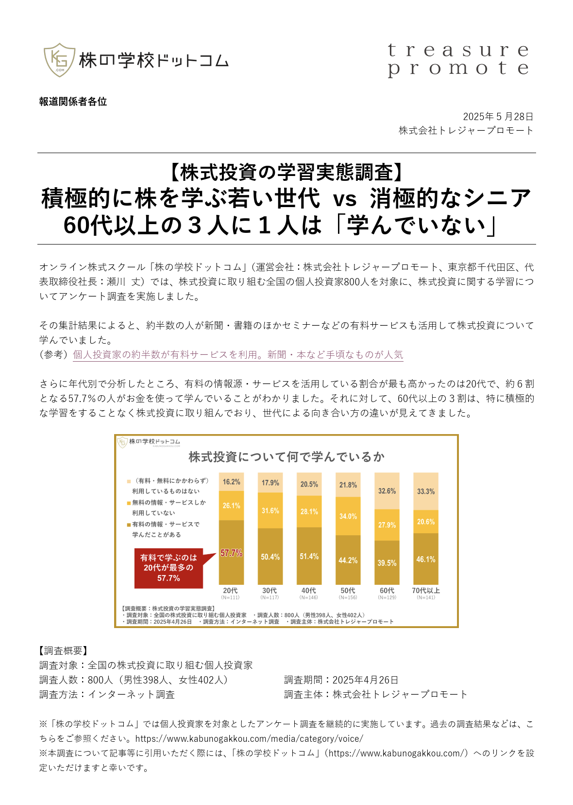 【株式投資の学習実態調査】積極的に株を学ぶ若い世代 vs 消極的なシニア60代以上の3人に1人は「学んでいない」