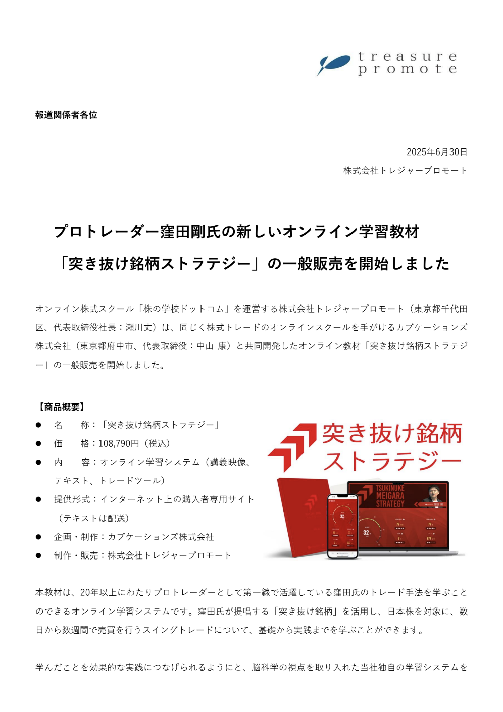 プロトレーダー窪田剛氏の新しいオンライン学習教材「突き抜け銘柄ストラテジー」の一般販売を開始しました