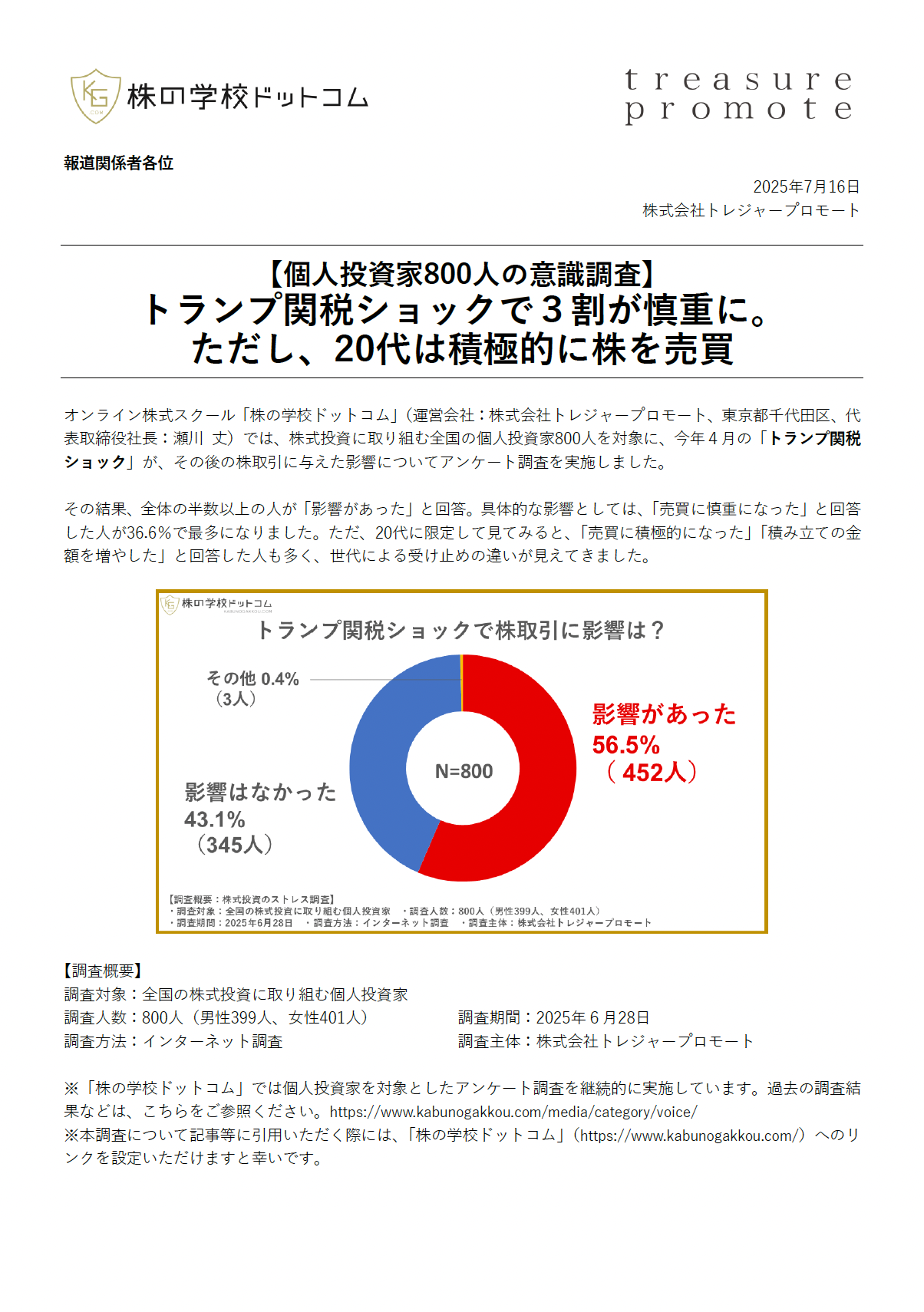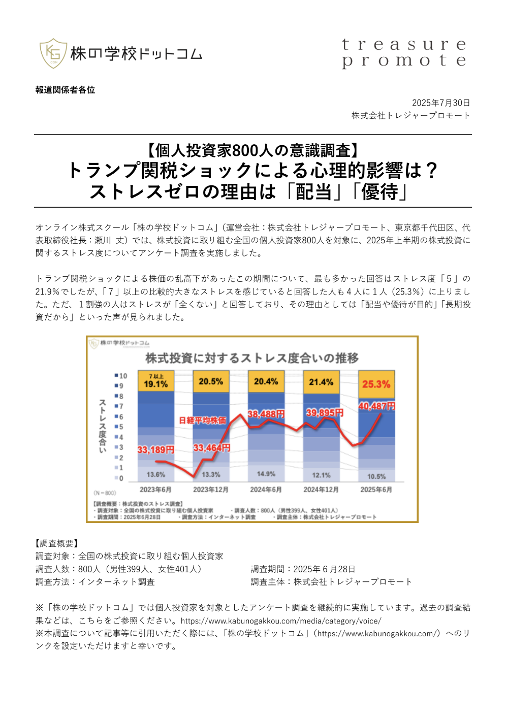 【個人投資家800人の意識調査】トランプ関税ショックによる心理的影響は?ストレスゼロの理由は「配当」「優待」