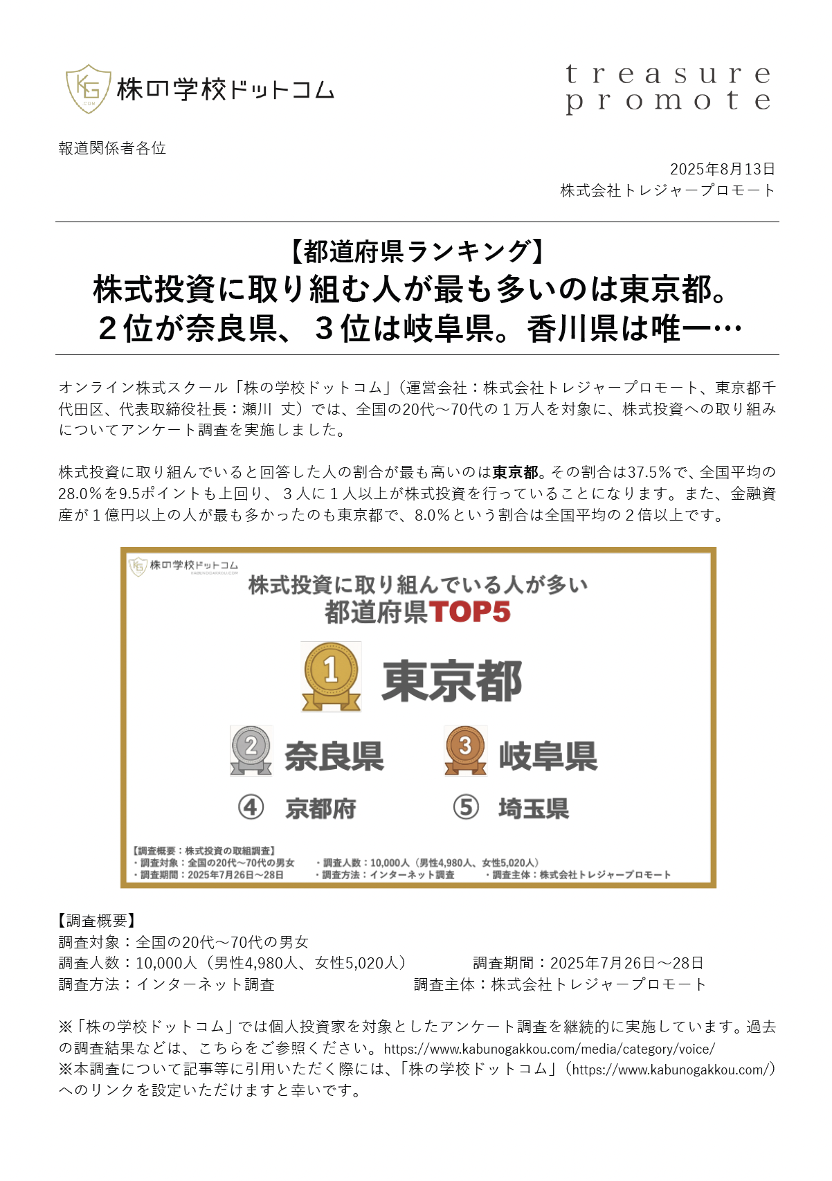 【都道府県ランキング】株式投資に取り組む人が最も多いのは東京都。2位が奈良県、3位は岐阜県。香川県は唯一…
