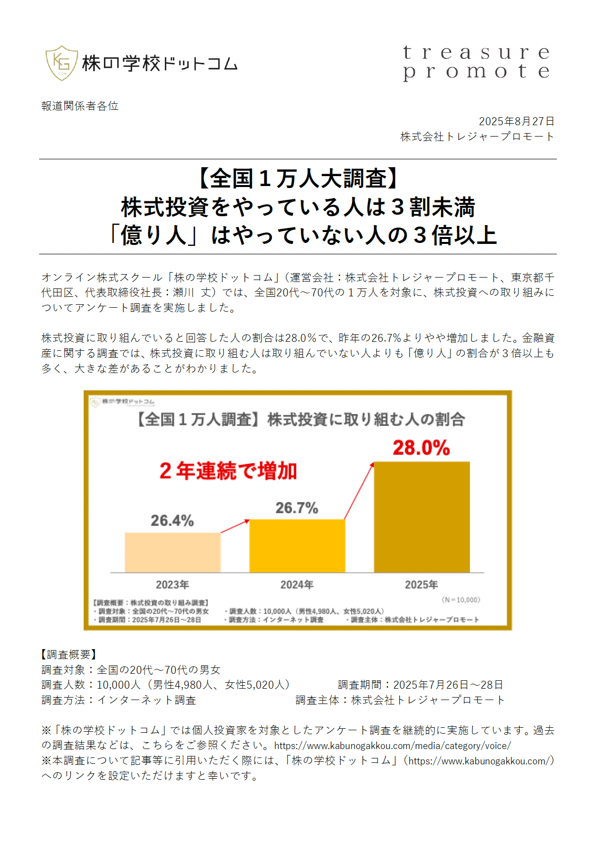 【全国1万人大調査】株式投資をやっている人は3割未満「億り人」はやっていない人の3倍以上