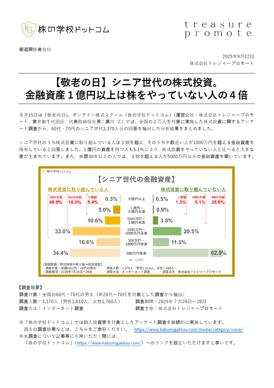 【敬老の日】シニア世代の株式投資。金融資産1億円以上は株をやっていない人の4倍