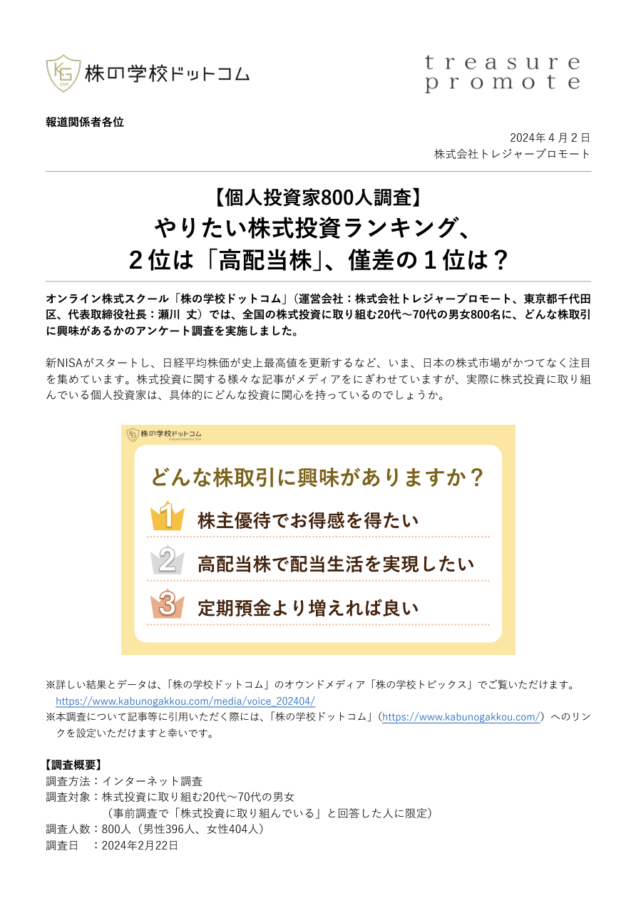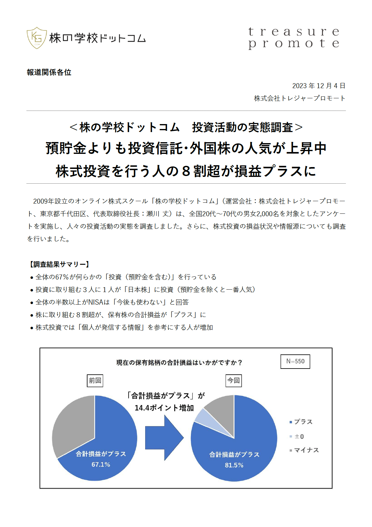 <株の学校ドットコム 投資活動の実態調査>預貯金よりも投資信託・外国株の人気が上昇中