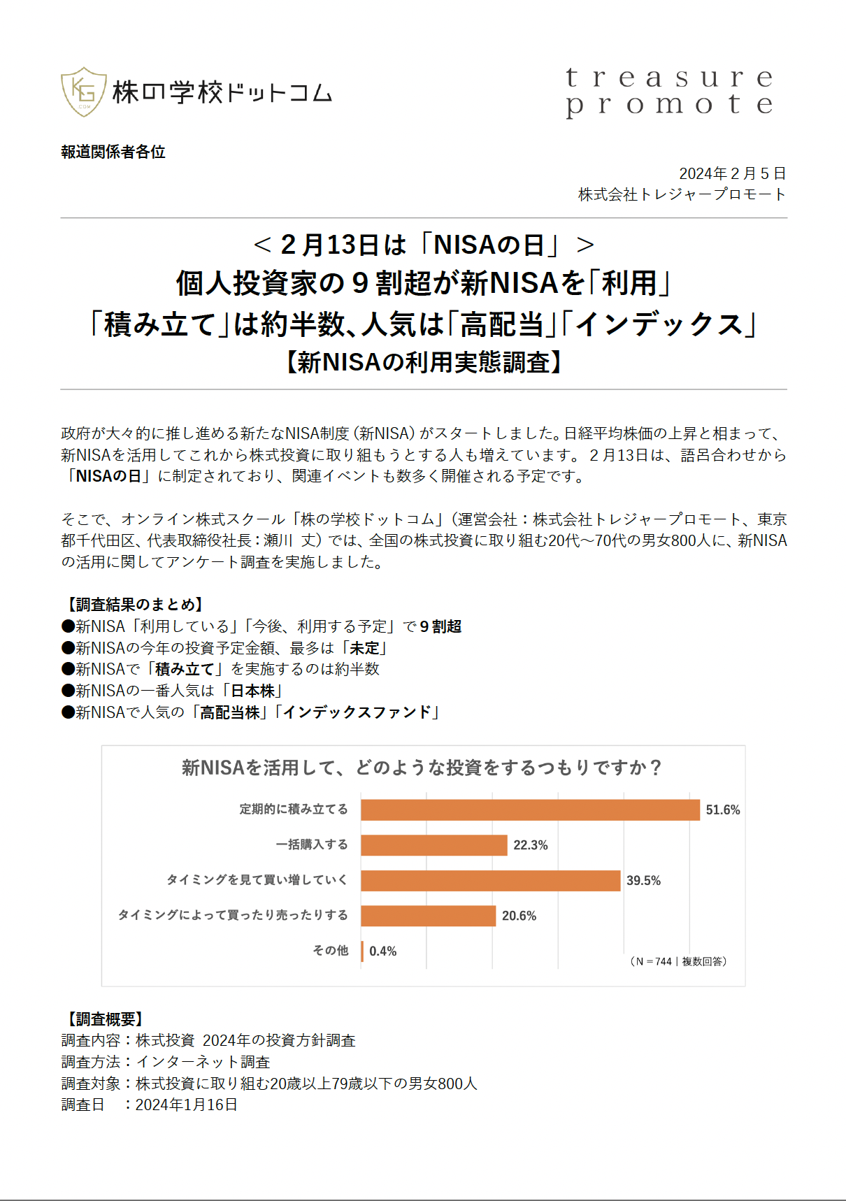 <2月13日は「NISAの日」>個人投資家の9割超が新NISAを「利用」「積み立て」は約半数、人気は「高配当」「インデックス」