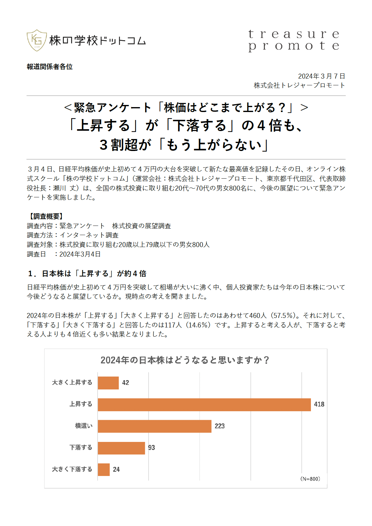 <緊急アンケート「株価はどこまで上がる?」>「上昇する」が「下落する」の4倍も、3割超が「もう上がらない」