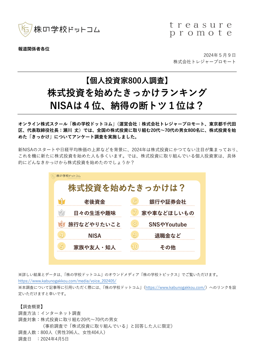 【個人投資家800人調査】株式投資を始めたきっかけランキングNISAは4位、納得の断トツ1位は?