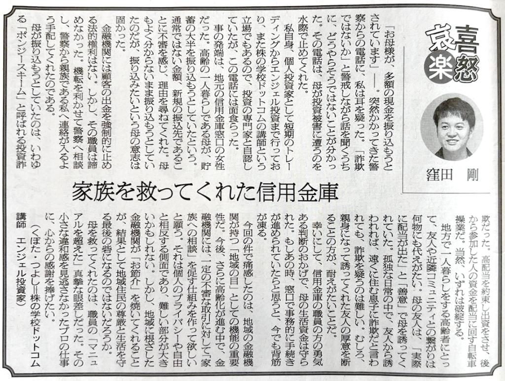 金融専門紙「金融経済新聞」2026年1月12日付(金融経済新聞社)の「喜怒哀楽」コーナーに、当校講師・窪田の寄稿が掲載されました。