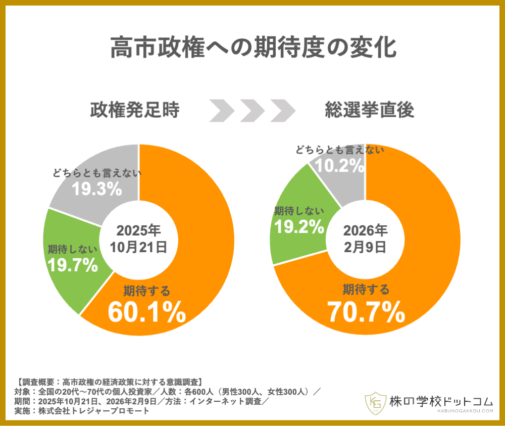 株の学校ドットコムでは昨年10月、高市政権の発足時にも同様の調査を行いました。今回を結果をそれと比較すると、「期待する」と回答した人の割合が60.1%から70.7%へ10ポイント上昇。それに対して、「どちらとも言えない」は、19.3%から10.2%にほぼ半減しました。「期待しない」はいずれも2割弱でした。