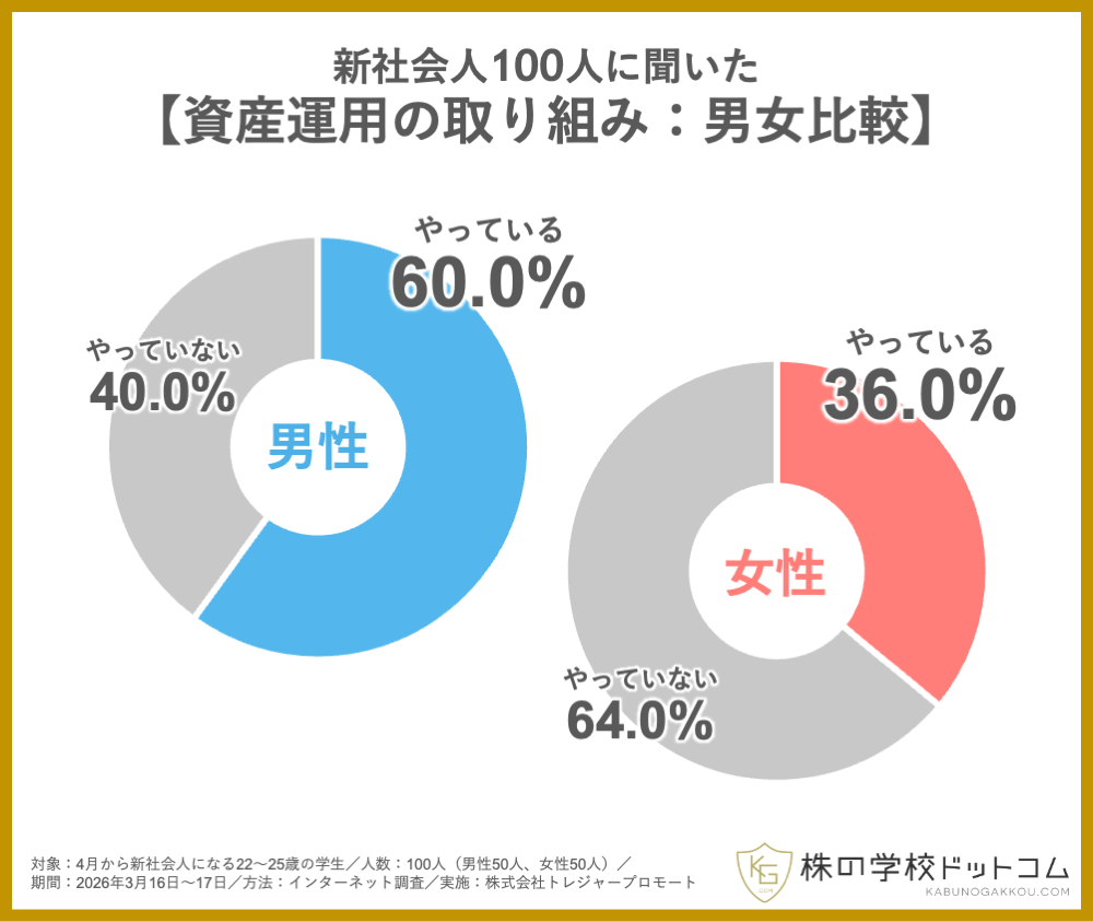 オンライン株式スクール「株の学校ドットコム」(運営会社:株式会社トレジャープロモート、東京都千代田区、代表取締役社長:瀬川 丈)は、この4月に新社会人となる学生100人を対象に、資産運用に関する実態調査を行いました。 その結果、およそ半数にあたる人が、すでになんらかの資産運用を始めていることがわかりました。投資をはじめとする資産形成が社会全体に浸透する中、若い世代の間では「お金を稼いでから」ではなく「学生のうちから」取り組むものへと意識が変化してきているのかもしれません。